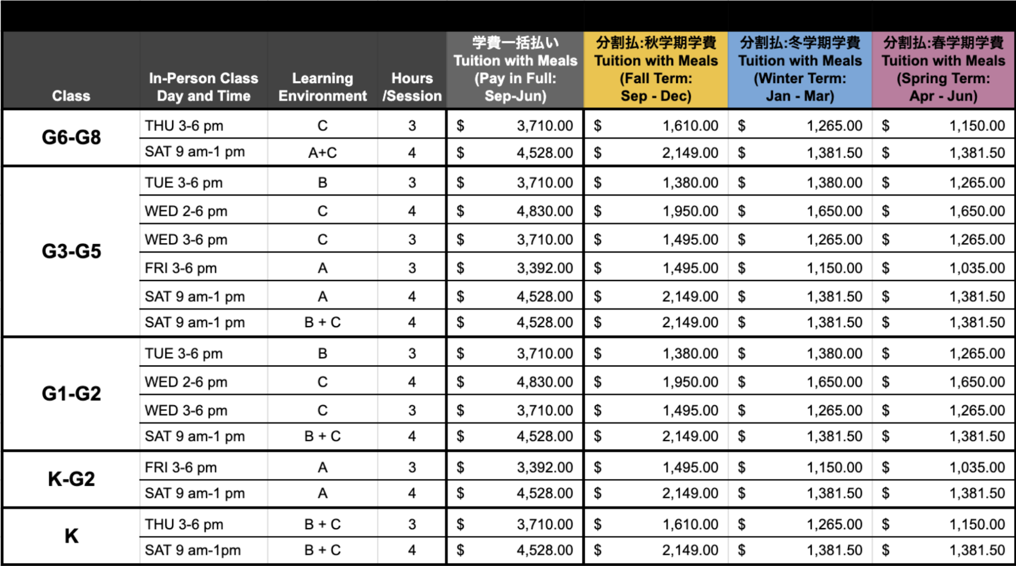 Learning Environment-A gives comprehensive instruction on the fundamentals of the Japanese Language in a manner that is supportive and nurturing of the students’ language abilities. Students are encouraged to use Japanese as much as possible in the classroom. Subjects and explanations are strongly supported with English to ensure the students understand the concepts and can use them effectively in the classroom and beyond.
